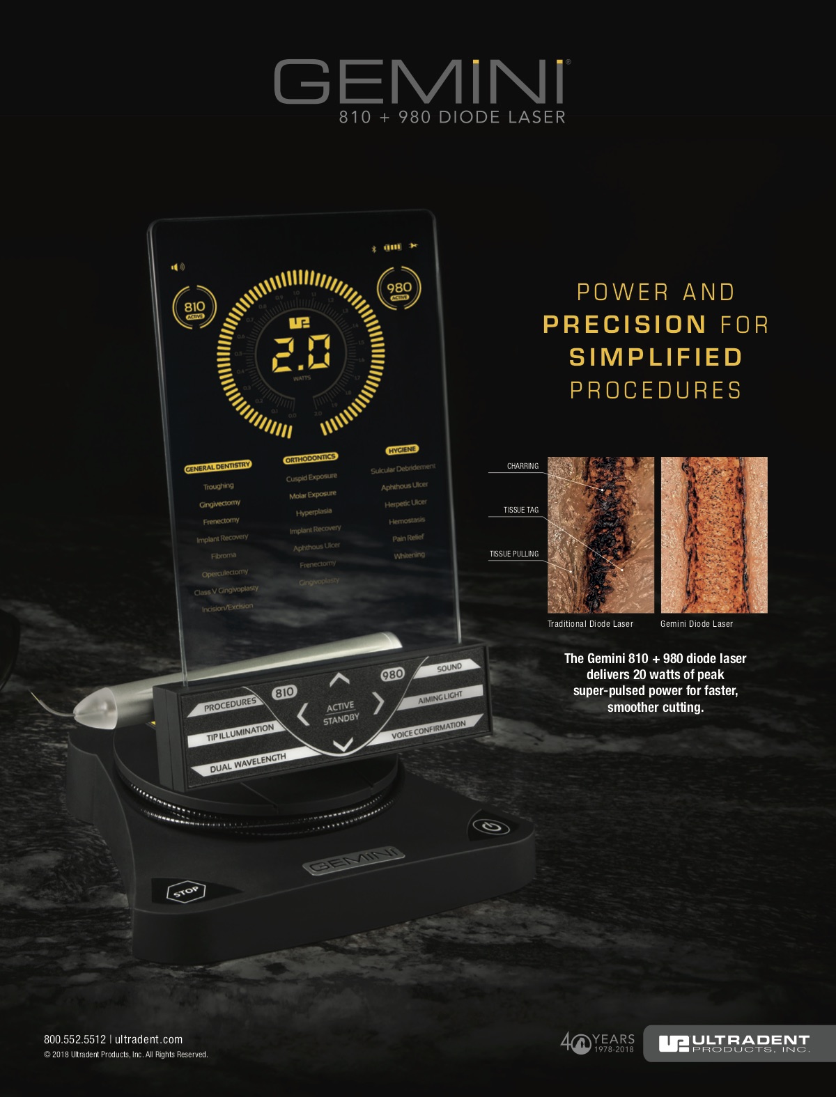 With the gemini laser by ultradent soft tissue laser dentistry is clean.